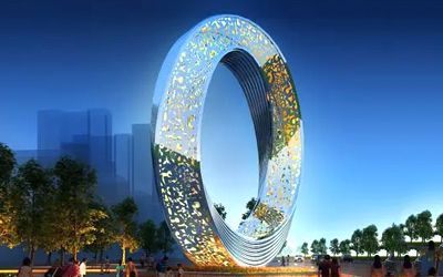 地產類不銹鋼雕塑以大氣磅礴為主要表現形式,一般都是抽象的,傳遞一種視覺上的震撼效果,常見如圓環、鏤空球、云朵、假山、浪花、水滴等等。